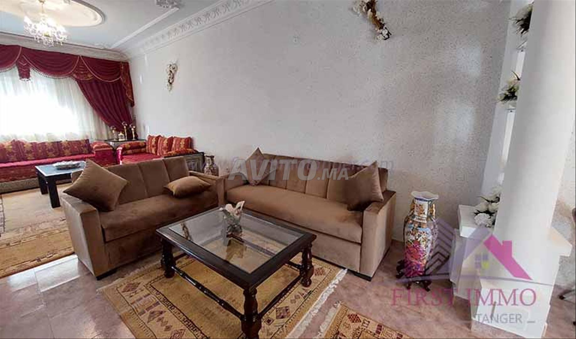 Tanger, Route de Rabat, à louer un lumineux appartement de 90 m² meublé Joli et simple , dans un immeuble R3 , calme et propre,se dotant de deux façades a 2 min du grand Axe Route de rabat et 10 min en voiture du centre ville . Il se compose ainsi d'un salon marocain, coin fauteuills , télé, 2 chambres dont la principale avec grand lit et placard, salle de bain douche , cuisine équipée .